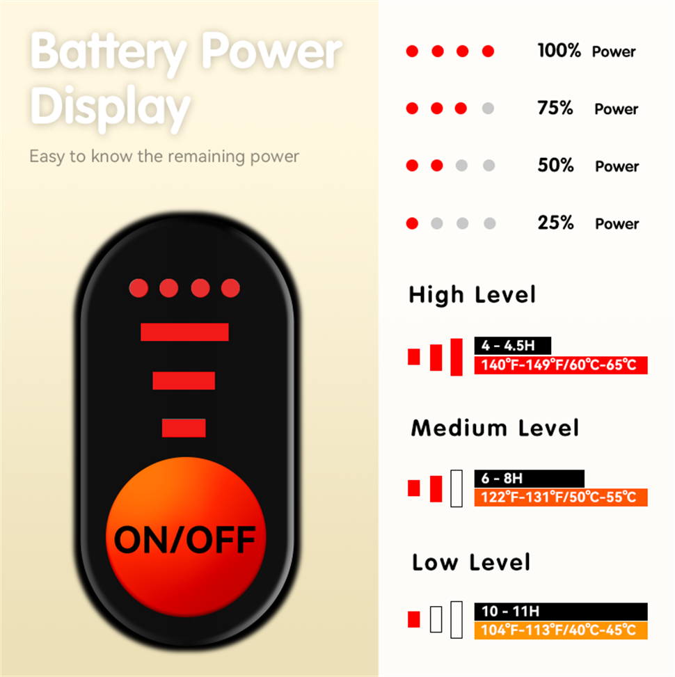 Перчатки оснащены аккумулятором 7,4 В / 3000 мАч, который обеспечивает равномерный нагрев тыльной стороны ладони и пальцев с помощью композитных нагревательных элементов. Это помогает сохранять тепло даже при длительном пребывании на улице.