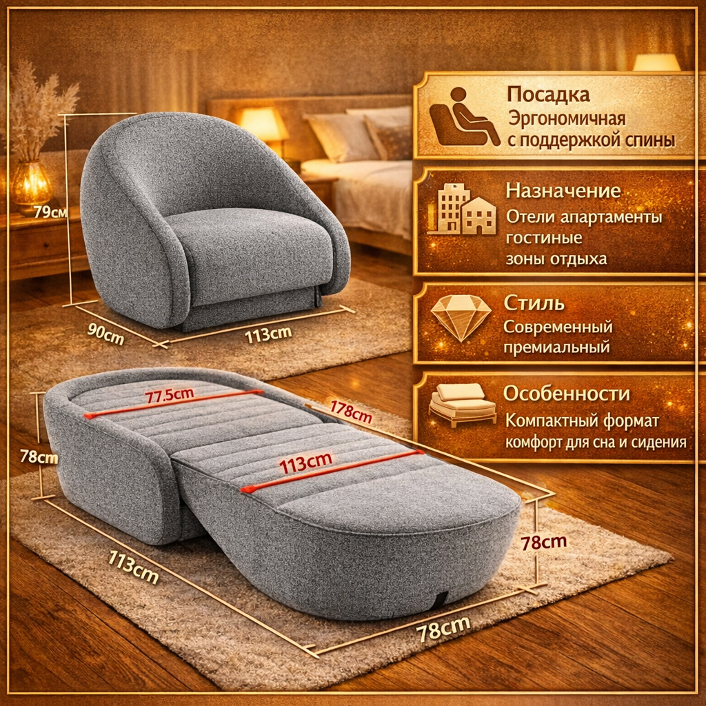 | Особенности: | Компактный формат, комфорт для сна и сидения |
