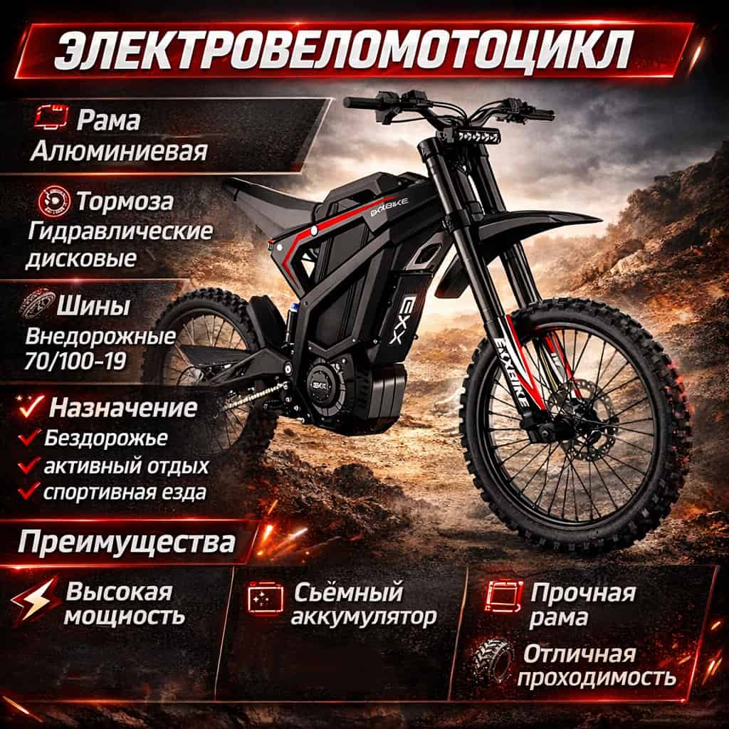 Электрический мотоцикл EKXBike M1 — мощный внедорожный e-bike для взрослых, рассчитанный на активную езду, бездорожье и спортивное использование. Модель создана для райдеров, которым важны высокая динамика, проходимость и надёжность в сложных условиях.