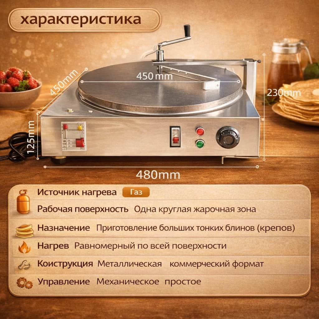 Большая круглая рабочая поверхность обеспечивает равномерный нагрев по всей площади, позволяя готовить тонкие и крупные крепы без подгорания и перепадов температуры. Газовый тип нагрева обеспечивает быстрый выход на рабочий режим и высокую энергоэффективность.