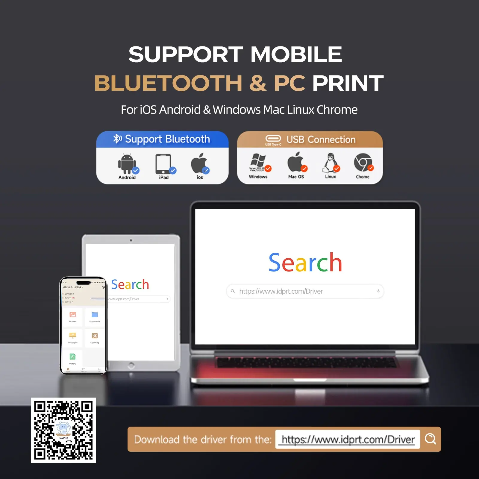 Принтер поддерживает подключение по USB и Bluetooth, что позволяет печатать напрямую со смартфона, планшета или ноутбука. Лёгкий корпус весом около 500 г делает модель удобной для переноски. Работает от питания 5V/2A и использует фирменную термобумагу HPRT шириной от 100 до 216 мм.