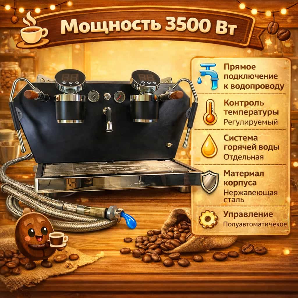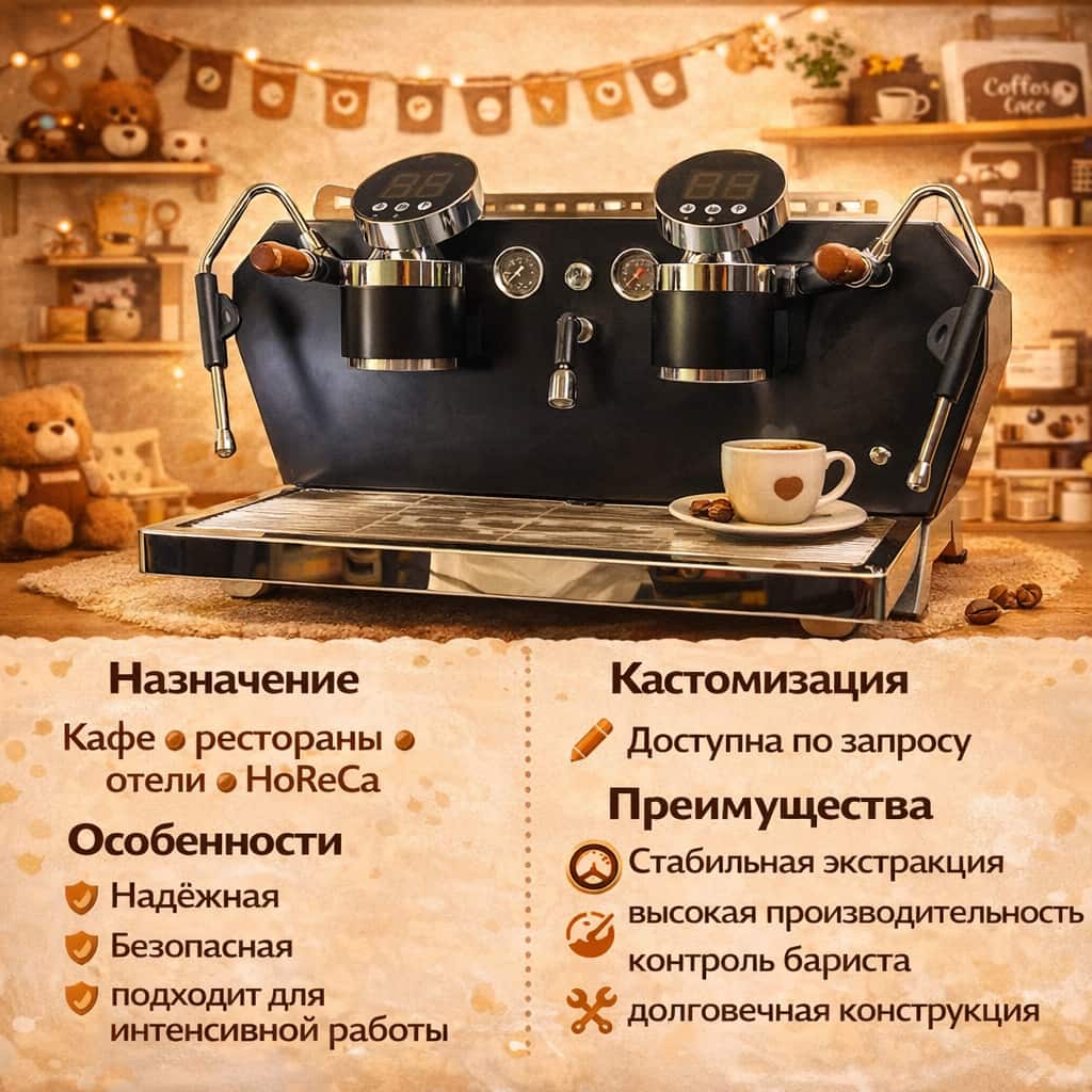 Мощность 3500 Вт, регулируемый контроль температуры, отдельная система горячей воды и классическое полуавтоматическое управление позволяют бариста контролировать процесс приготовления, сохраняя высокую производительность. Корпус из нержавеющей стали обеспечивает долговечность, безопасность и презентабельный внешний вид. Возможна кастомизация под бренд или проект.
