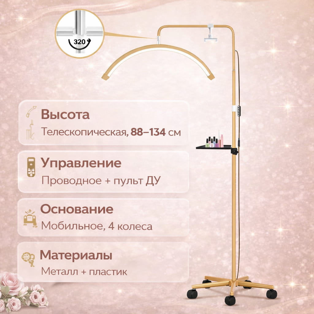 Мобильное основание на 4 колёсах позволяет легко перемещать светильник по кабинету, а телескопическая стойка и поворотная голова обеспечивают точную настройку света под рабочую зону. Высокий индекс цветопередачи CRI ≥ 90 гарантирует правильную передачу оттенков кожи и материалов.