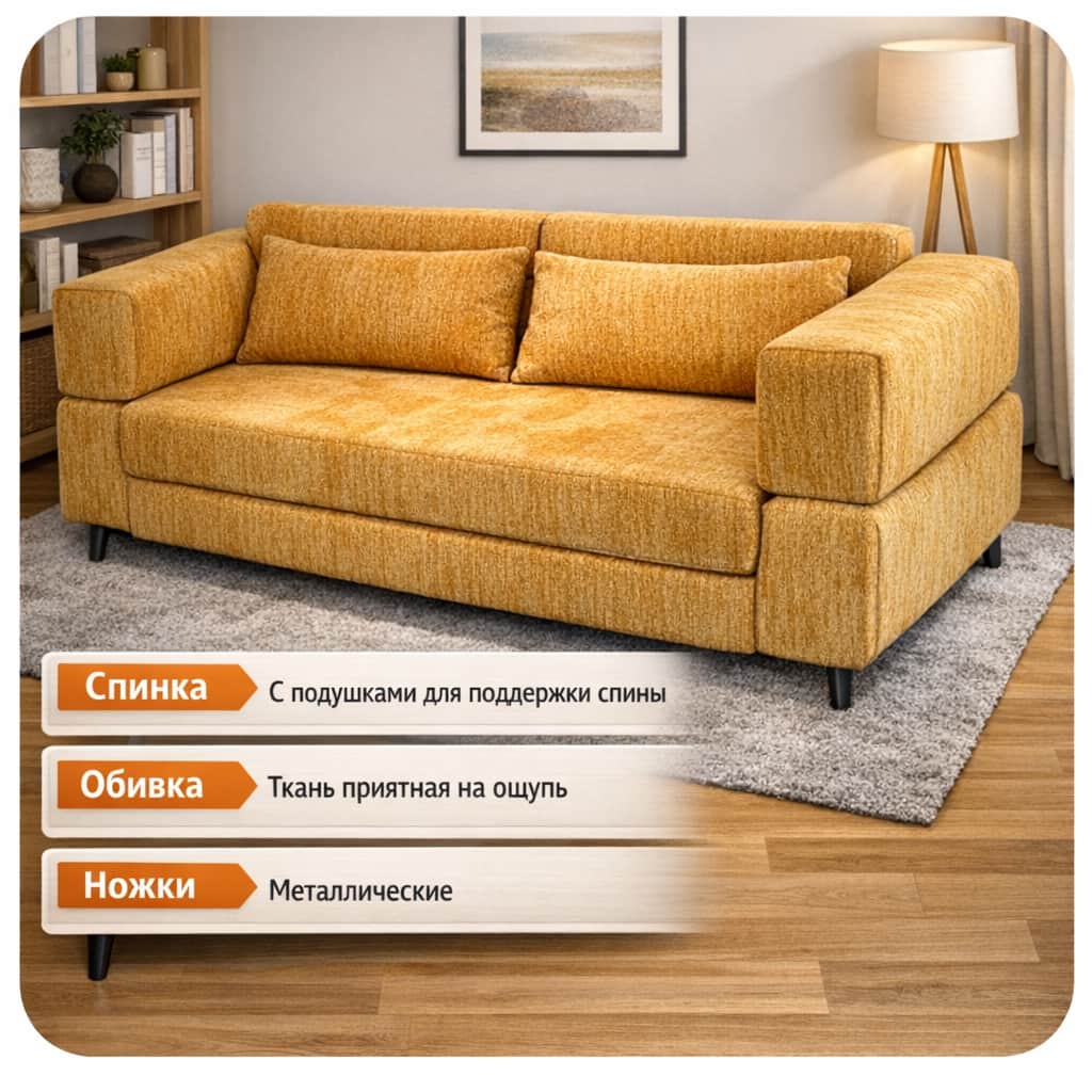 Спинка с мягкими подушками поддерживает спину и снижает нагрузку во время отдыха. Тканевая обивка приятна на ощупь и гармонично вписывается в современные интерьеры. Металлические ножки придают устойчивость и подчёркивают актуальный стиль. Возможен индивидуальный подбор цвета и дизайна под запрос клиента.